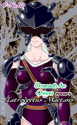 | 過去: | Latrodectus Mactans(黒後家蜘蛛) 盗賊団Aranea Media Noxのメンバーの一人、但し盗みの能力は低い。 代わりに身に付けた、相手の急所を付く技術を活かして、メンバーが盗みを働いている間警護を行う。 Nephila Clavataの妹。 |